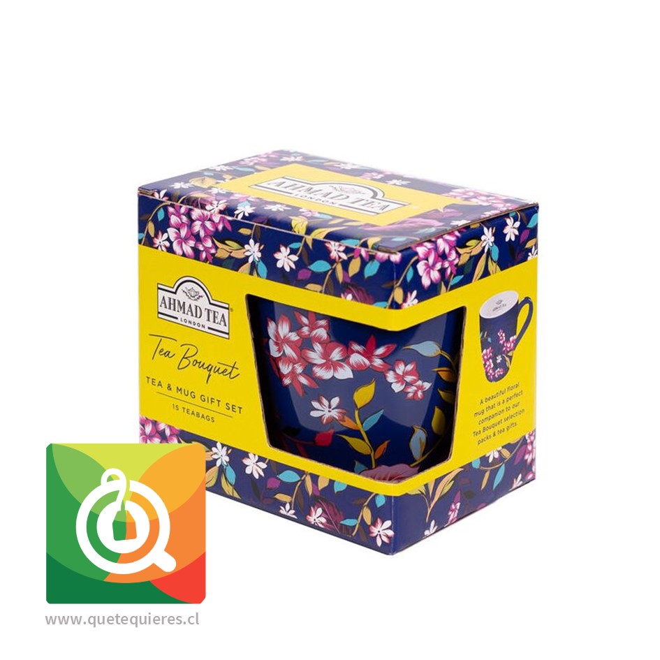 Set que contiene un mug floreado marca Ahmad y 15 bolsitas de té en su interior.